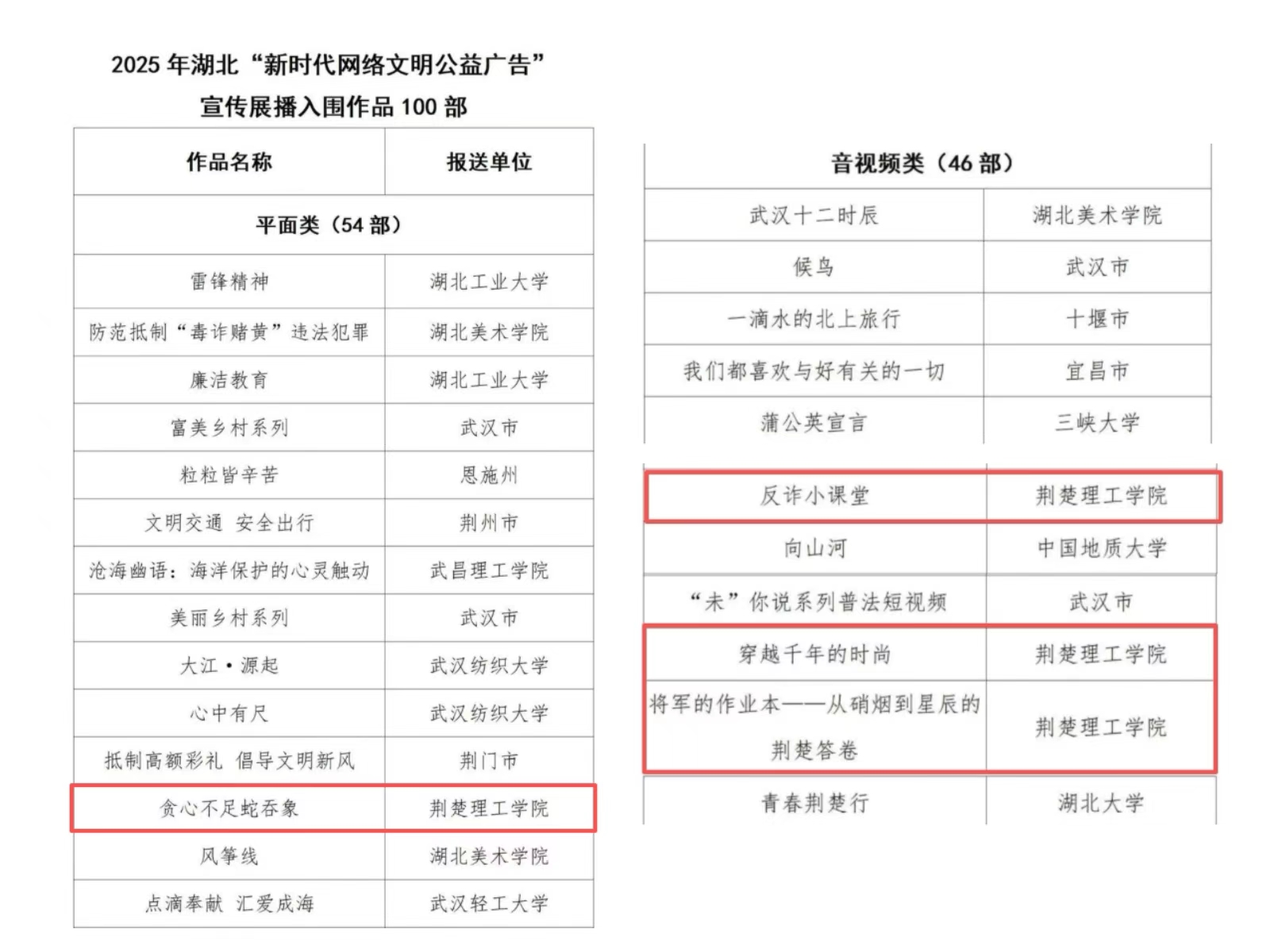12月2日,2025年湖北“新时代网络文明公益广告”征集活动100部入围展播作品揭晓,我校选送的《贪心不足蛇吞象》《穿越千年的时尚》《将军的作业本——从硝烟到星辰的荆楚答卷》《反诈小课堂》4部作品成功跻身榜单。