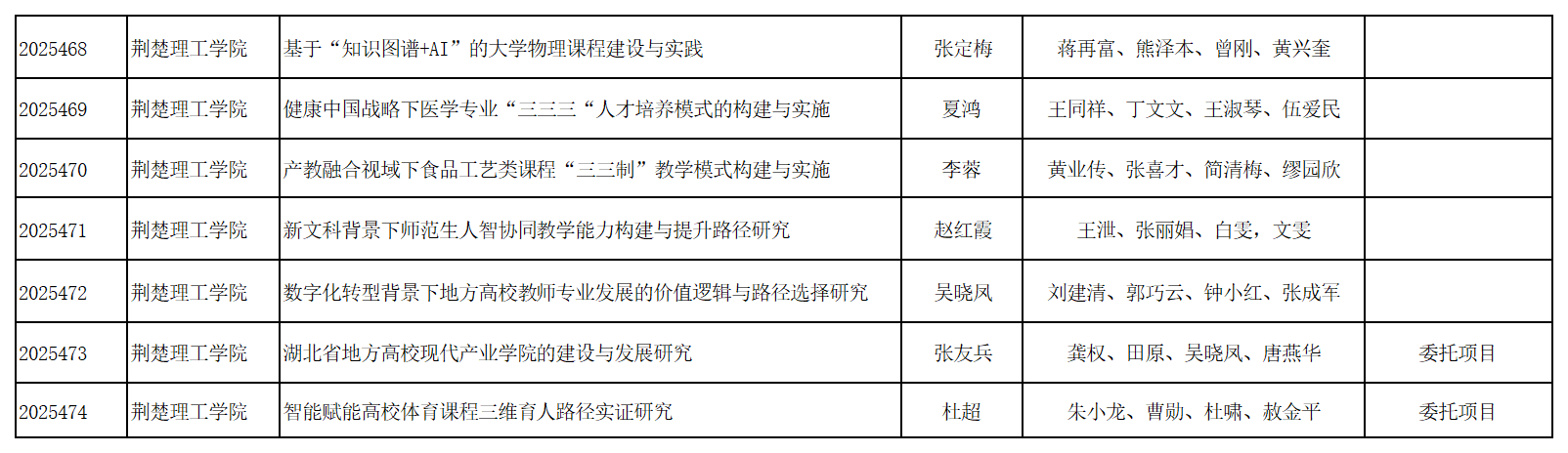 近日,湖北省教育厅发布了《省教育厅关于公布2025年湖北本科高校省级教学改革研究项目的通知》(鄂教高函〔2025〕17号),我校获批7项省级教学改革研究项目,其中2项委托项目。