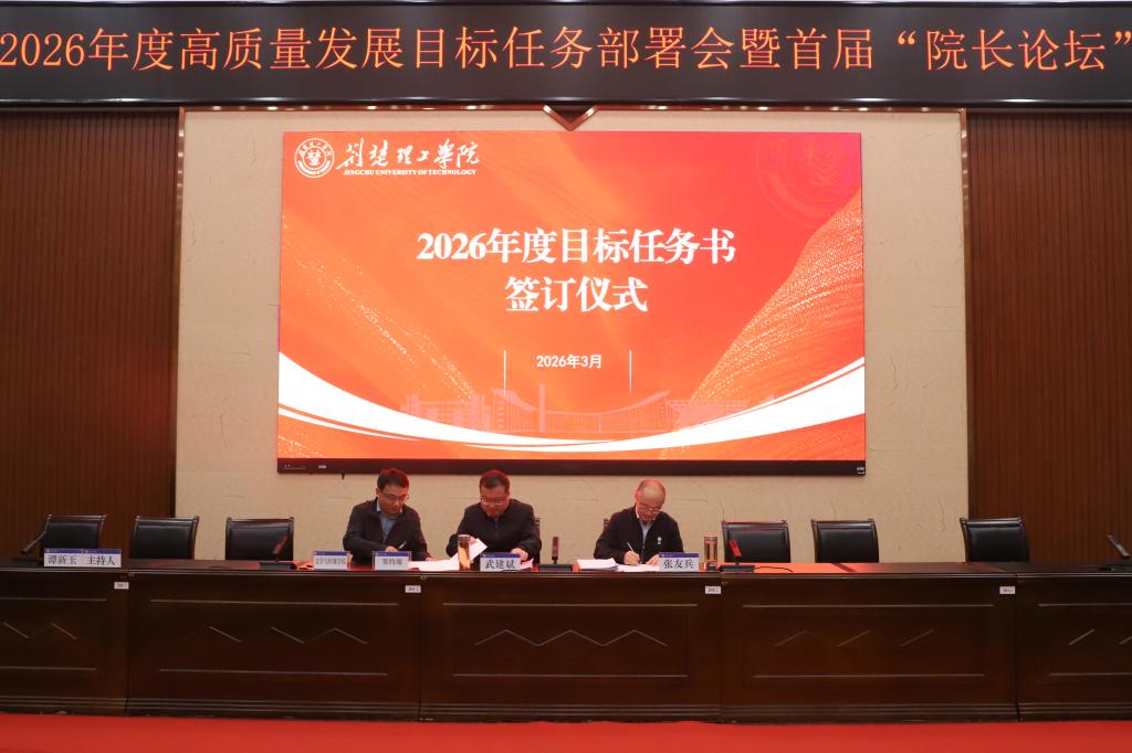 会上,表彰了2025年度先进集体和个人,与会校领导为获奖代表颁奖。党委书记武建斌、校长张友兵代表学校与教务处、科技处、新能源学院、文学与传媒学院等四个单位负责人签订2026年度目标任务书。