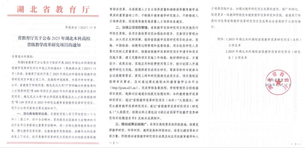近日,湖北省教育厅发布了《省教育厅关于公布2025年湖北本科高校省级教学改革研究项目的通知》(鄂教高函〔2025〕17号),我校获批7项省级教学改革研究项目,其中2项委托项目。